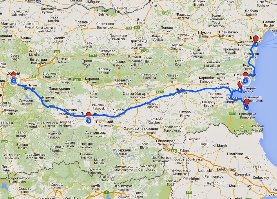 Promocja LOTu do Sofii zaoowocowała tygodniowym urlopem w Bułgarii. Oto nasza trasa, bazę noclegową mieliśmy w Słonecznym Brzegu, z ostatnią nocą w Plovdiv.