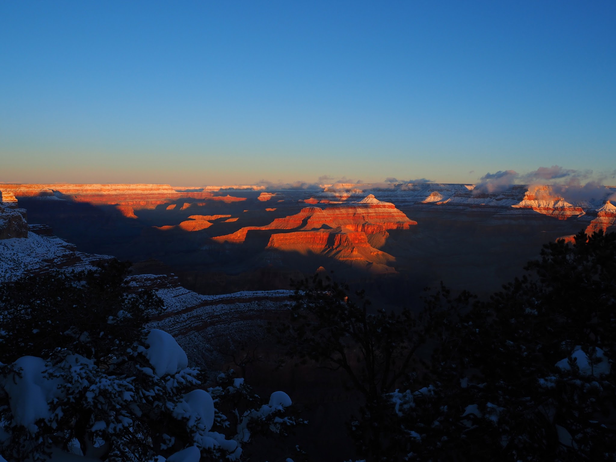 Kiedy wstaliśmy rano, nie do końca byliśmy pewni, czy nie skończy się jak ostatnim razem. Ze słońcem schowanym jeszcze za horyzontem ciężko było ocenić, czy mgła nie popsuje nam widoku… Na Yavapai Point, który upatrzyliśmy sobie jako najlepsze miejsce do wschodu słońca, była już grupka Chińczyków, którzy wyłaniające się zza skał słońce chwytali klatka po klatce, nie zauważając nawet, że najpiękniejszy widok rozpościera się dokładnie po przeciwnej stronie 🙂 Było -18 stopni, trzaskający mróz sprawiał, że nawet naciskanie palcem spustu od aparatu było wyzwaniem, także z żalem zabraliśmy szybciutko nasze zmarznięte cztery litery na śniadanie do pobliskiej Yavapai Lodge, żeby nabrać sił na krótki trekking, który zaplanowaliśmy na przedpołudnie.