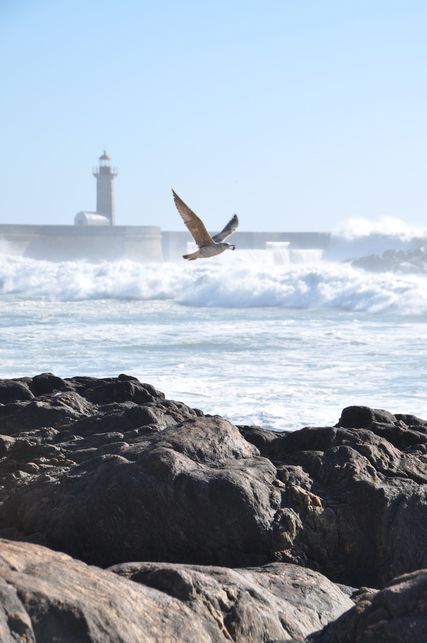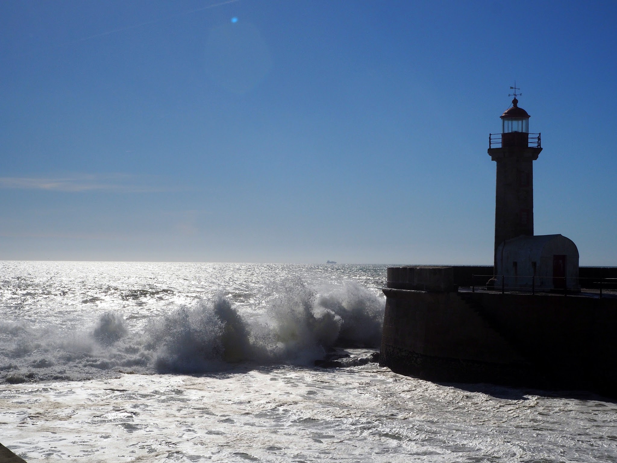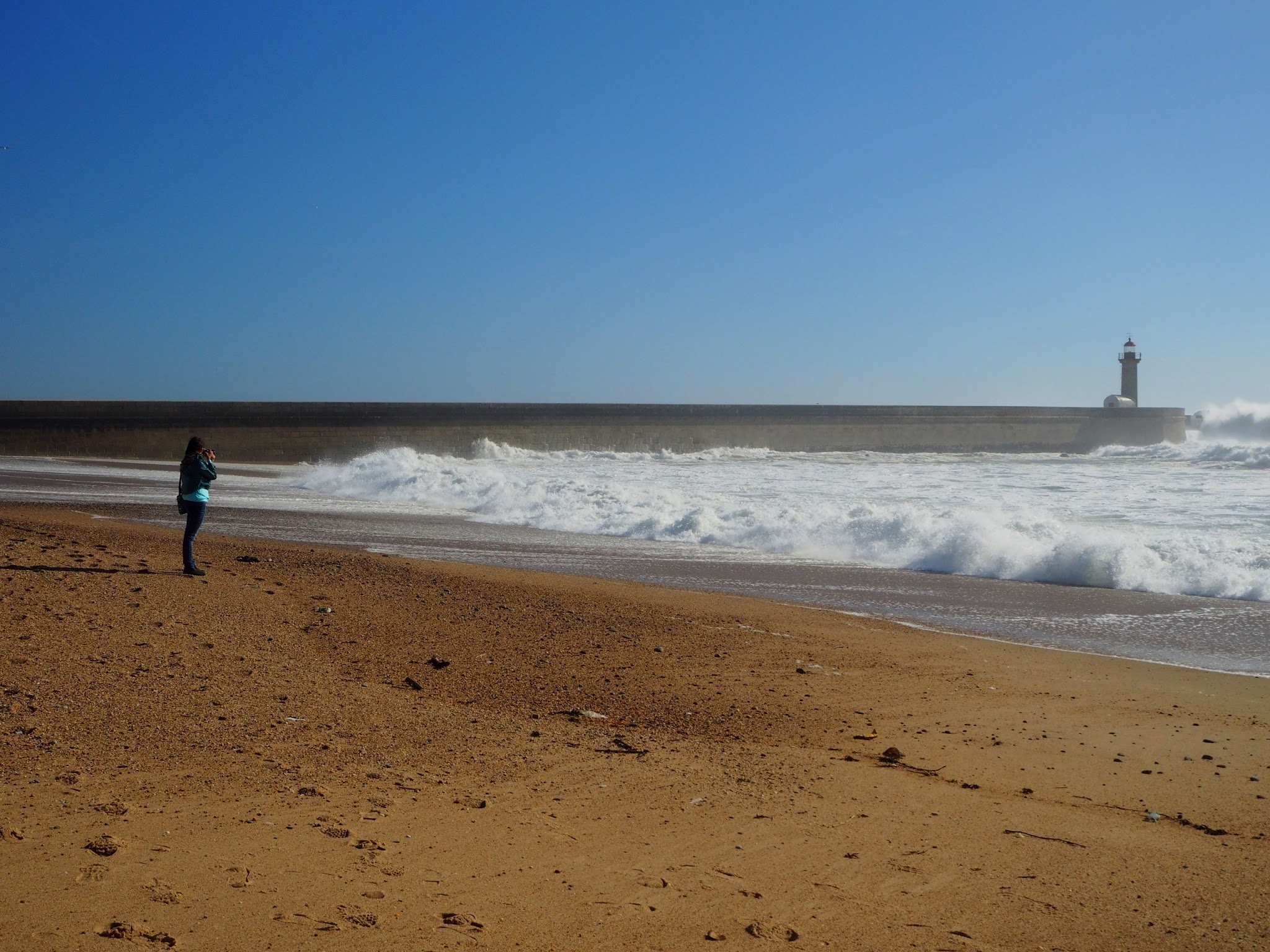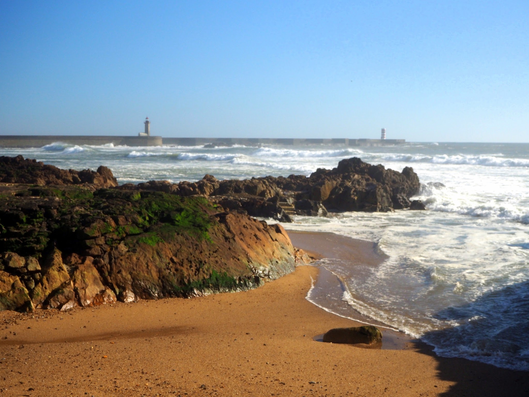 Promenada jest ładnie utrzymana, z ławeczkami i pomostami, wychodzącymi gdzieniegdzie w nadmorskie skały, są place zabaw dla dzieci, także ani się obejrzałyśmy, a doszłyśmy prawie do plaży Matosinhos. Ten odcinek pomiędzy Foz do Douro a zamkiem Queijo (Forte de Sao) jest chyba najładniejszy spacerowo, potem zaczynają się majaczyć w oddali zabudowania portowe i robi się bardziej industrialnie.