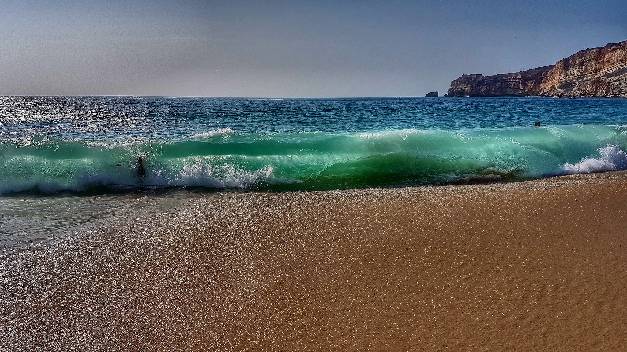 Co tu dużo mówić, fajny klimat ma ta plaża, a jakie zachody słońca 🙂 Ludzi bardzo dużo, parawanów też, ale fale są idealne – dla dzieci wystarczające, żeby pobawić się bodyboardem, a dla dorosłych na tyle małe, żeby nie osiwieli pilnując swoich pociech. Baaardzo polecamy malutką knajpkę na półwyspie, jedliśmy tam najpyszniejszy stek z tuńczyka i grillowaną ośmiornicę w naprawdę niskich cenach: Taberna do Ganhao. Ten adres warto zapisać!