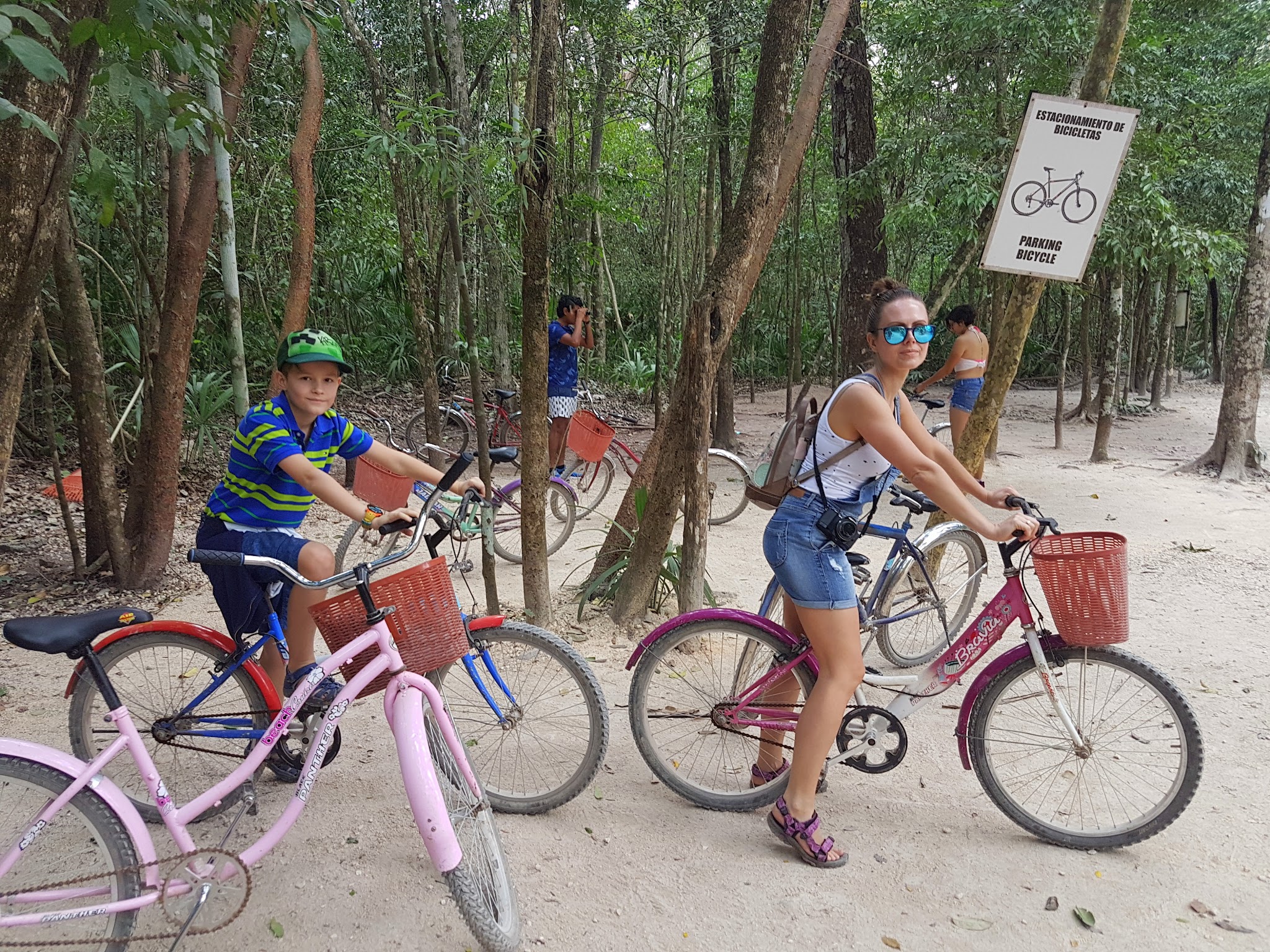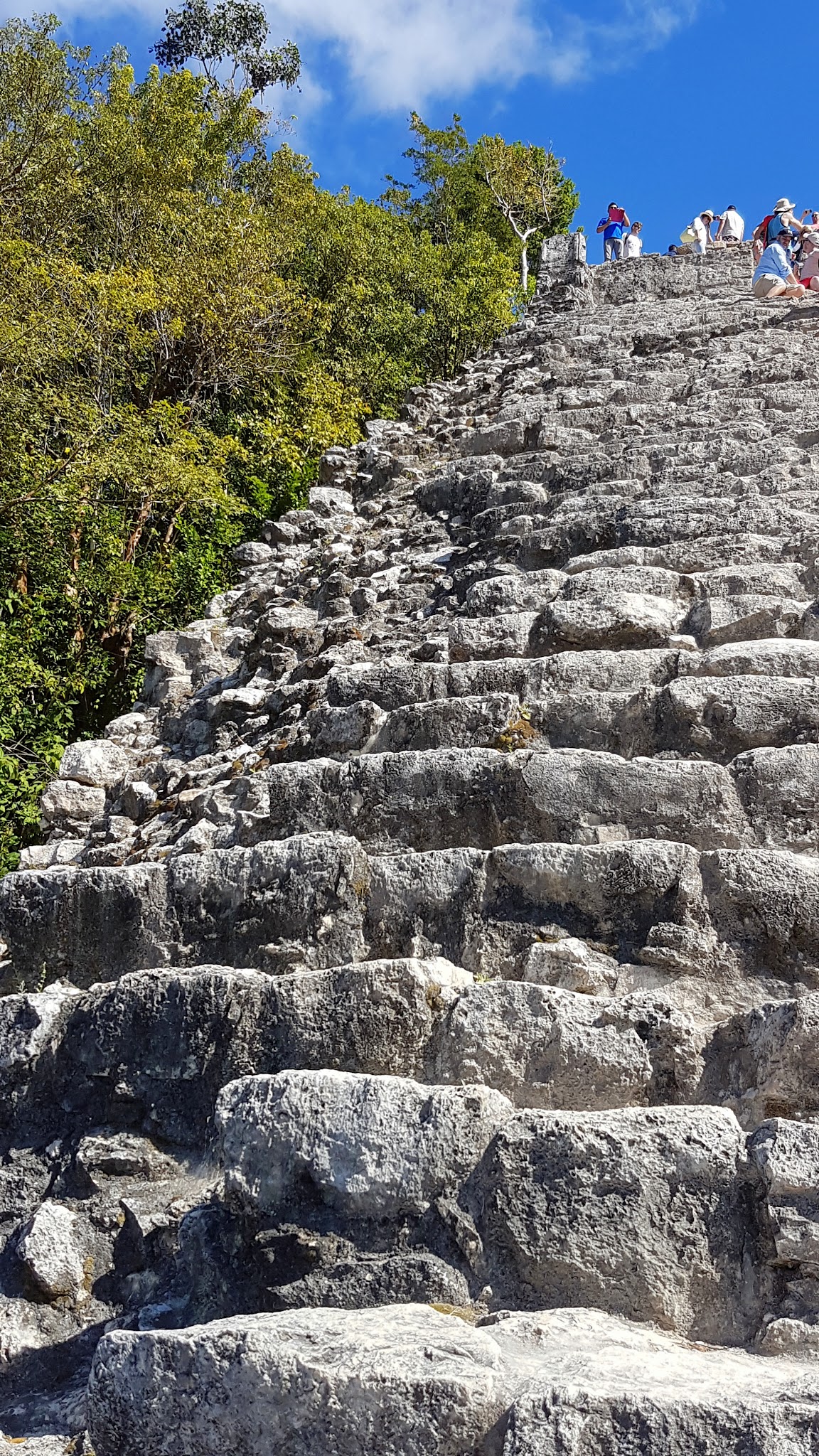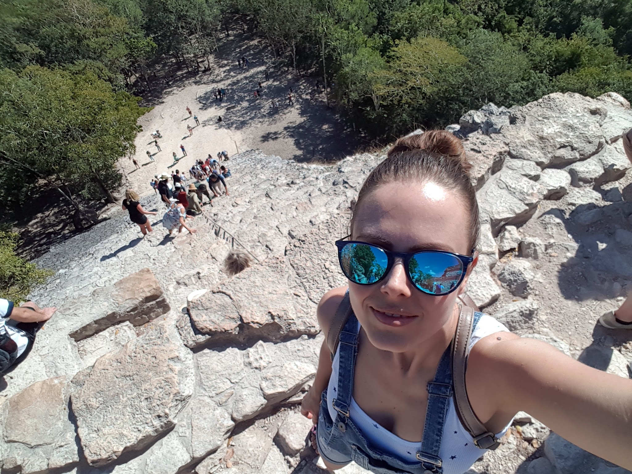 Dotarliśmy tam jeszcze przed południem, ludzi było sporo, ale w sumie tego się spodziewaliśmy. Główny urok tego miejsca polega na tym, że można wypożyczyć tam rowery lub rowerowe taxi i uroczą, zacienioną alejką jeździć pomiędzy majańskimi ruinami i w ten sposób dotrzeć do najwyższej na tym terenie piramidy Nohoch Mul. Odległości nie są duże, spokojnie można sobie zrobić spacer, jeśli ktoś nie chce wypożyczać rowerów. Meksykanie co roku grożą, że zamkną piramidę dla zwiedzających, bo zdarzają się tam wypadki, ale co roku okazuje się, że „jeszcze w tym roku nic się nie zmieni”. Fakt schody są bardzo strome, a widok z góry oszałamiający, zwłaszcza, jeśli to Wasze pierwsze ruiny. Idealne miejsce na selfie – just sayin’