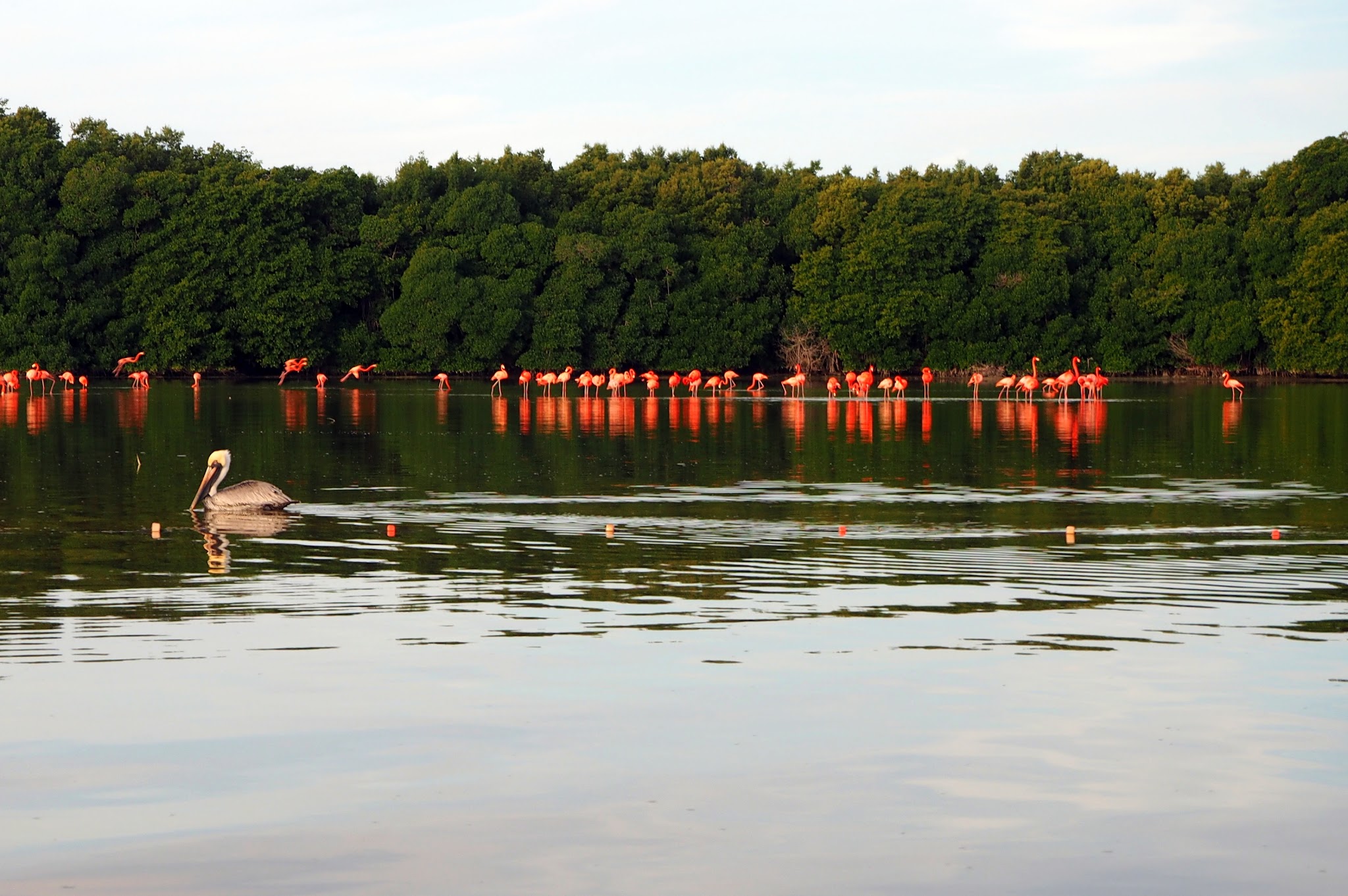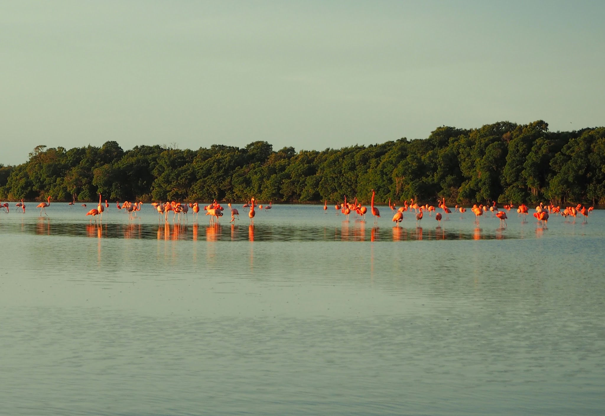 Ze spoilera wiecie już, że Celestun bardzo przypadło nam gustu 🙂 Samo miasteczko to dziura zabita dechami, ale położona nad piękną długą plażą z wręcz niesamowitą ilością muszli i błękitną wodą. Turyści przybywają tu tłumnie, ale zwykle na krótko, żeby zobaczyć flamingi, które przylatują całymi stadami paść się w płyciznach Ria Celestun. Standardowym sposobem zwiedzania jest wypad motorówką z plaży lub z przystani przy moście, ale my chcieliśmy spróbować czegoś innego. Jeszcze w Polsce nawiązaliśmy kontakt z sympatycznym Jose z Manglares de Dzinitun i zarezerwowaliśmy wycieczkę w canoe, tak żeby z samego rana, cichutko przepłynąć przez tunele namorzynowe i w blasku wschodzącego słońca podziwiać te niesamowite ptaki, nie przeszkadzając im w śniadaniu.