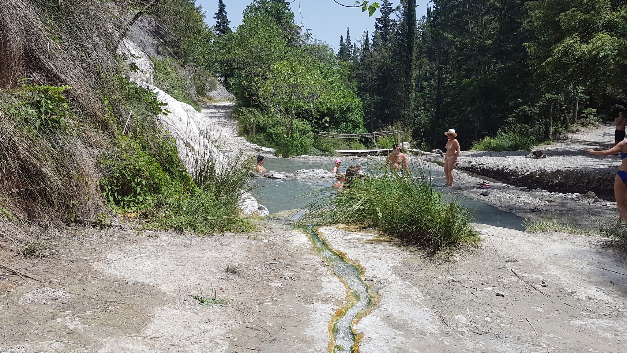 Im niżej, tym chłodniej i ludzi przybywa, aby osiągnąć kulminację tuż przy wielkim białym tworze skalnym, który nadał nazwę temu niezwykłemu miejscu. Bo skale nie można chodzić, chociaż ludzie na zakaz raczej nie zwracają uwagi i nie udało mi się zrobić zdjęcia bez przypadkowych roznegliżowanych spacerowiczów. Jak jesteście niedaleko, na pewno warto tam podjechać, obłożyć się podobno cuda działającym błotkiem, spłukać w gorącym lub chłodnym źródle, ale więcej niż 2 godziny raczej bym na waszym miejscu na Fossa Bianca nie rezerwowała 🙂