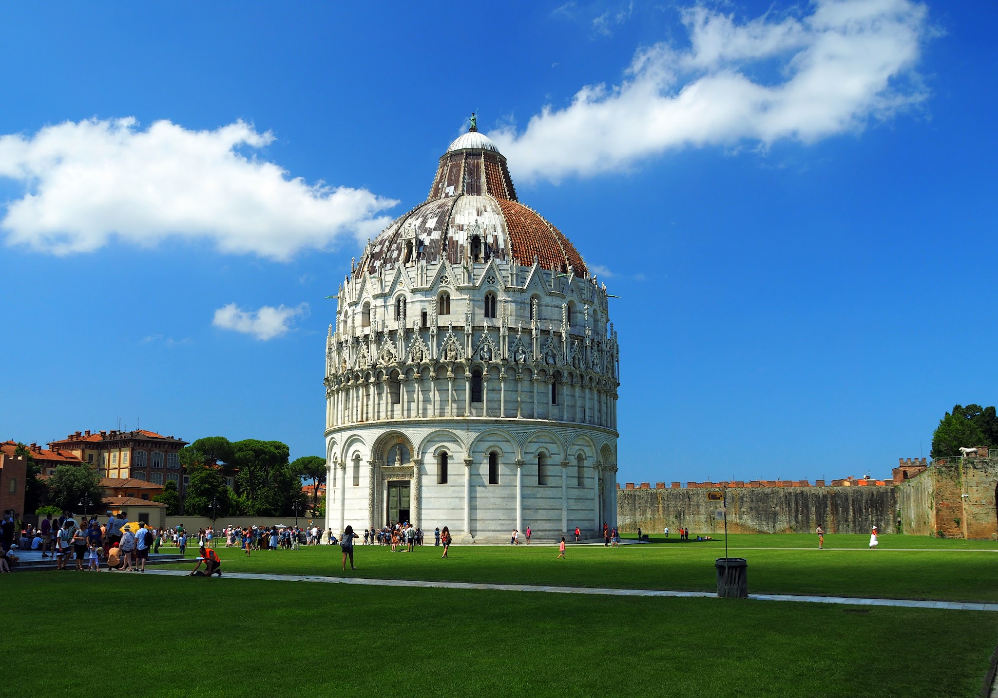 Nasi znajomi zniechęcali nas do Pizy, do której trafili rok wcześniej w środku upalnego zatłoczonego dnia, ale ponieważ nasz układ lotów i tak nas tam prowadził, pomyśleliśmy, że przenocujemy niedaleko lotniska i przy okazji zwiedzimy słynny, bądź co bądź, cud świata. I to był strzał w 10! Sam nocleg choć dość przeciętny, dał nam możliwość spacerku późnym popołudniem, kiedy już wszystkie autobusy turystyczne dawno dały hasło do odwrotu, było czym oddychać, a okolica samej wieży nieco opustoszała. Samo miasto też nas przyjemnie rozczarowało swoimi urokliwymi placykami z małymi restauracyjkami, ładnie oświetloną nadrzeczną promenadą i nocnym życiem na starówce. Kolejnego dnia przed wylotem udało nam się zwiedzić Baptysterium, katedrę i mauzoleum, bilety kupiliśmy na spokojnie przez internet tutaj.