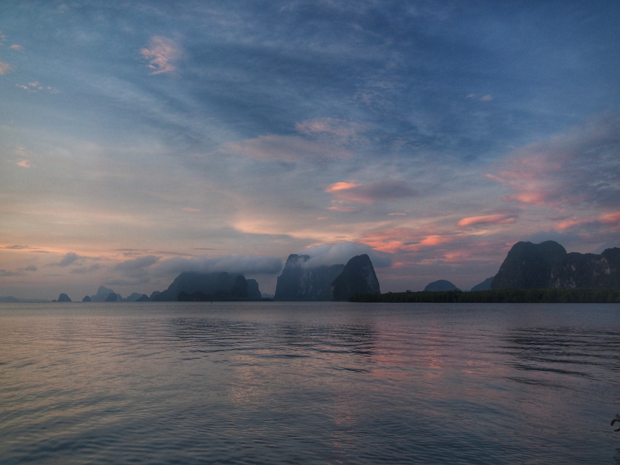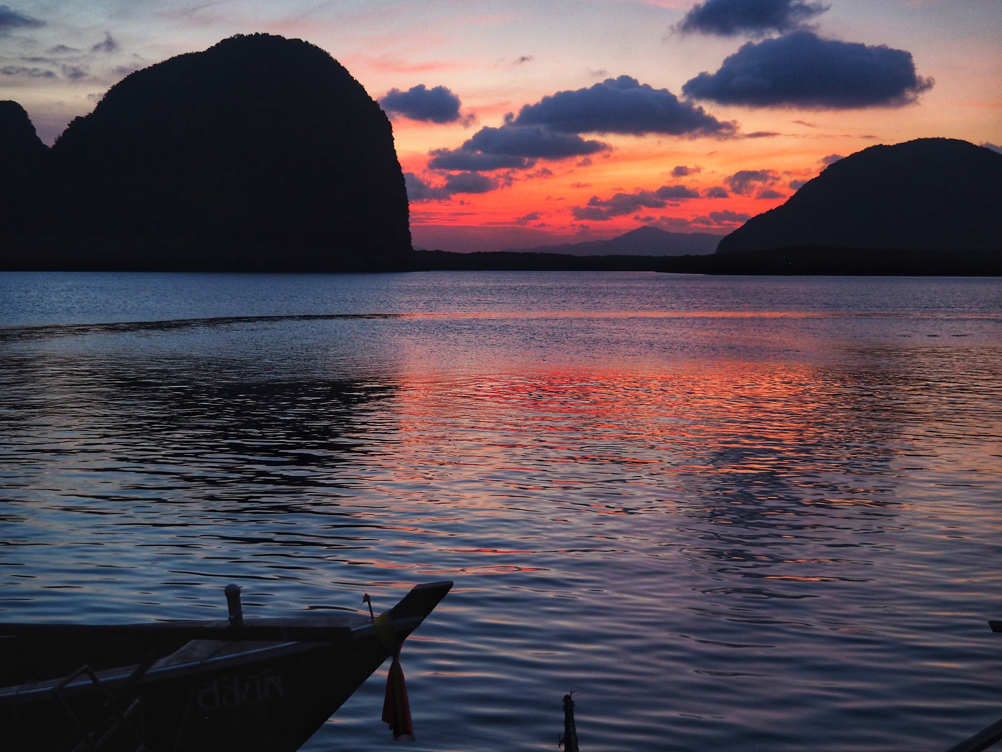 Kierując się powoli z powrotem w stronę Krabi, naszą uwagę przyciągnął namorzynowy park narodowy Ao Phang-nga. Zarezerwowaliśmy sobie na niego 3 noclegi w różowych bungalowach o wdzięcznej nazwie James Bond Bungalows, zaśmiewając się do łez z sesji zdjęciowej obiektu. Jak już trafiliśmy na miejsce, nasz śmiech zmienił się w nerwowe spojrzenia po sobie. Oczekiwaliśmy bungalowów nad morzem, z dostępem do plaży i bliskością restauracji. Wylądowaliśmy w muzułmańskiej wiosce na palach, gdzie muezin i łodzie z głośnymi silnikami budziły nas o 5 rano, restauracje były wyłącznie turystyczne i odpowiednio drogie, a kolacja w obiekcie miała stałą cenę 300THB(!) od osoby, w sklepach nie można było kupić nawet butelki piwa, a transport na ląd i z powrotem kosztował 1200THB… W wodzie otaczającej wioskę nie wykąpałabym nawet wroga, mieszanka ścieków, benzyny i śmieci gwarantuje natychmiastową sepsę! Wykupiliśmy 2 przepłacone wycieczki u właściciela i uciekliśmy stamtąd po 2 nocy… Jedyne, co będę miło wspominać to widok z tarasu, dzięki wczesnej pobudce przez silniki mieliśmy okazję podziwiać tam nie tylko zachód, ale i wschód słońca 🙂