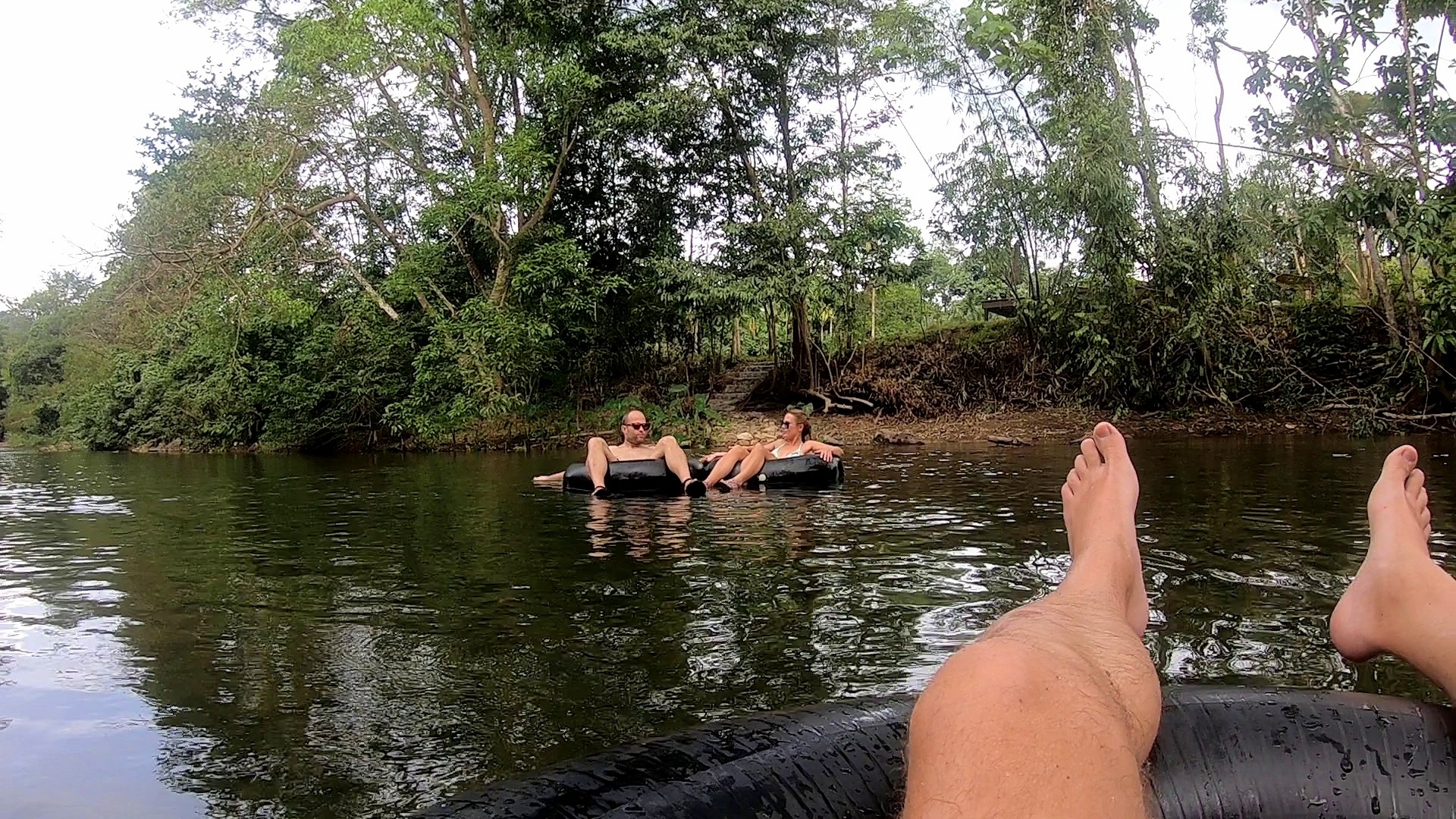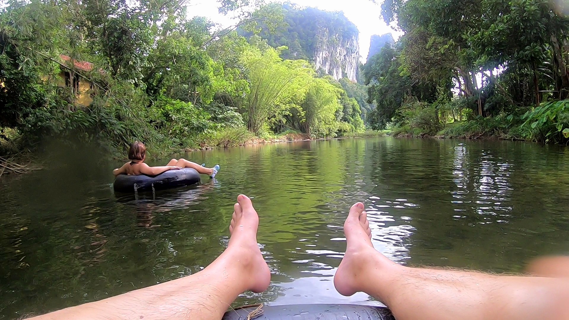 Niestety pogoda pokrzyżowała nam plany trekkingu do pobliskich wodospadów (wizja spływających z deszczem pijawek jakoś nam się nie uśmiechała), ale udało nam się spłynąć w oponach, gdzie po drodze mogliśmy podziwiać małpy, śpiące na gałęziach węże i majestatyczne białe klify. To był naprawdę miły dwugodzinny chillout (300THB) !