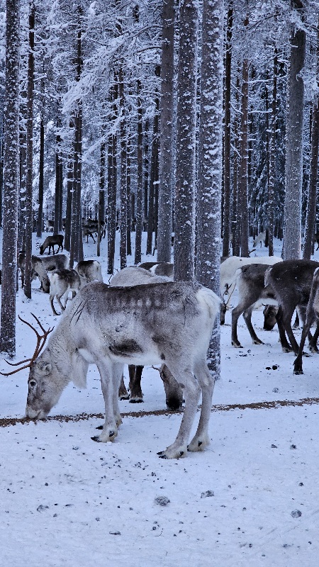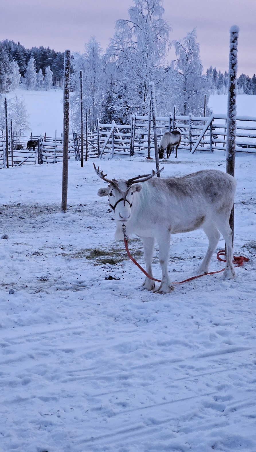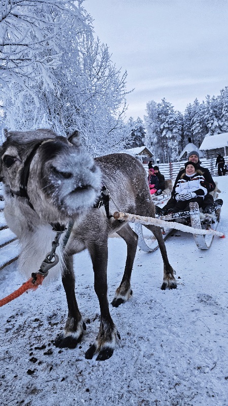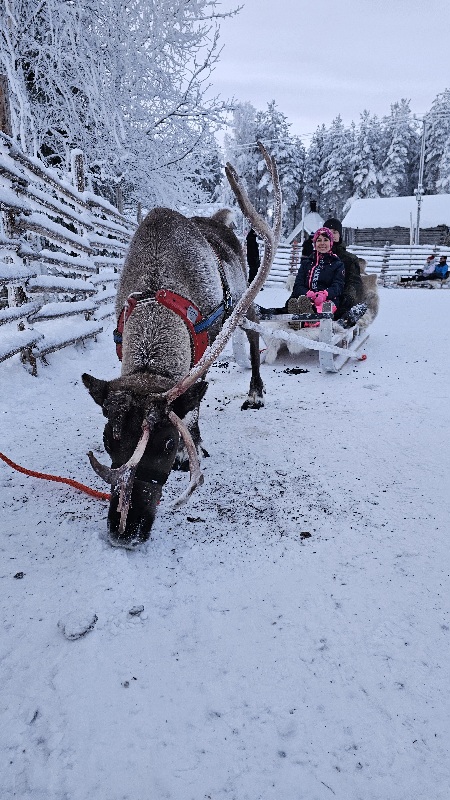 Podobnie jak z pieskami, wybór miejsc z reniferami jest ogromny, dlatego dla nas ważne było, żeby było to miejsce kameralne, dbające o zwierzęta i działające w oparciu o poszanowanie przyrody. Z tych względów wybraliśmy farmę SieriPoro, gdzie co prawda masowo nie głaszcze się reniferów (nie lubią tego, bo to półdzikie zwierzęta), ale za to można przejechać się w zaprzęgniętych w nie saniach, dowiedzieć się wielu ciekawych rzeczy i napić się ciepłego soku jagodowego przy palenisku w tradycyjnej chacie.