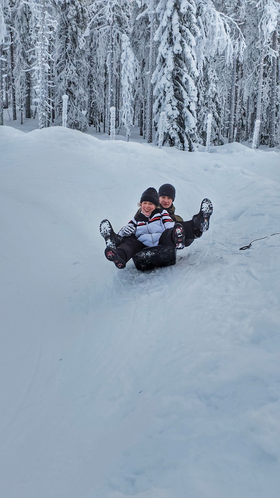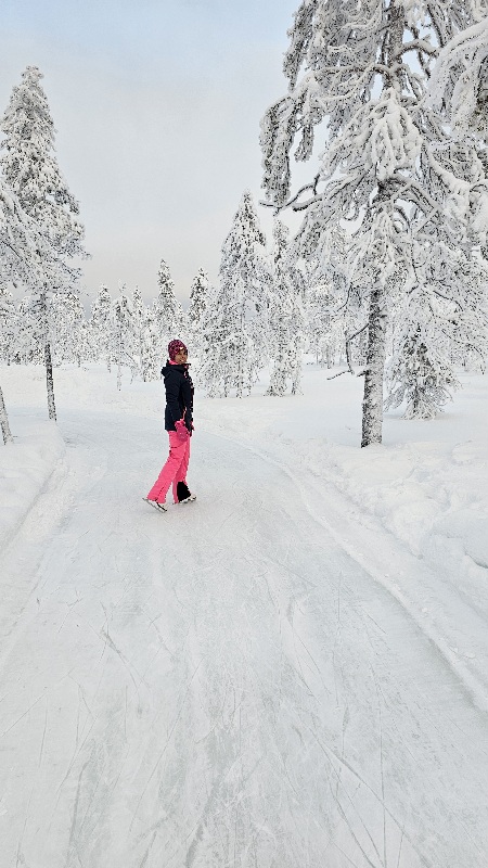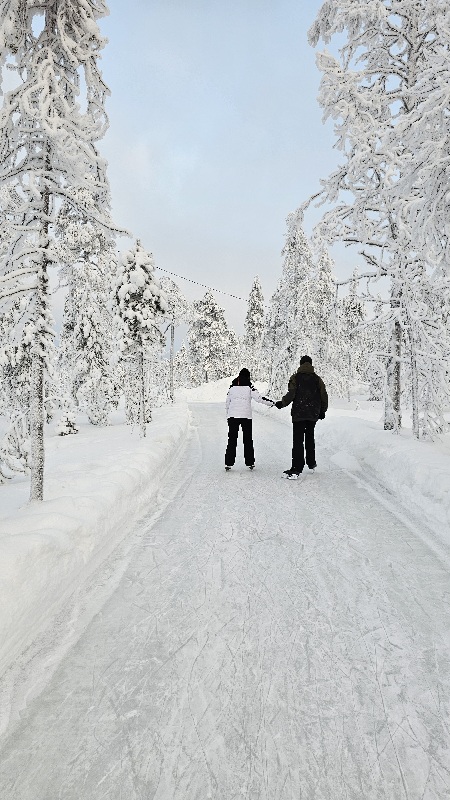 Nasza ekipa w 75% jest 18+, ale kto nie potrzebuje czasem odnaleźć swojego wewnętrznego dziecka? 🙂 Jeśli tak jak my, macie czasem taką potrzebę, odwiedźcie resort Kotatieva. Jest tam jedyne w okolicy Rovaniemi (przynajmniej wg mojego researchu) lodowisko wylane między drzewami, które co prawda wymaga umiejętności poruszania się na łyżwach po niezbyt gładkiej powierzchni, ale za to super wygląda na zdjęciach i filmach 🙂 Jest też górka, z dostępnymi sankami i matami, a także palenisko, kafejka i restauracja.